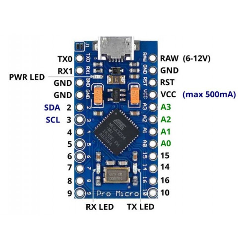 The Micro is a microcontroller board based on the ATmega32U4. It has 20 digital input/output pins (of which 7 can be used as PWM outputs and 12 as analog inputs), a 16 MHz crystal oscillator, a micro USB connection, an ICSP header, and a reset button.