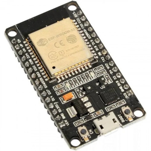 It contains the entire basic support circuitry for the ESP-WROOM-32, including the USB-UART bridge, reset- and boot-mode buttons, LDO regulator and a micro-USB connector. Every important GPIO is available to the developer.